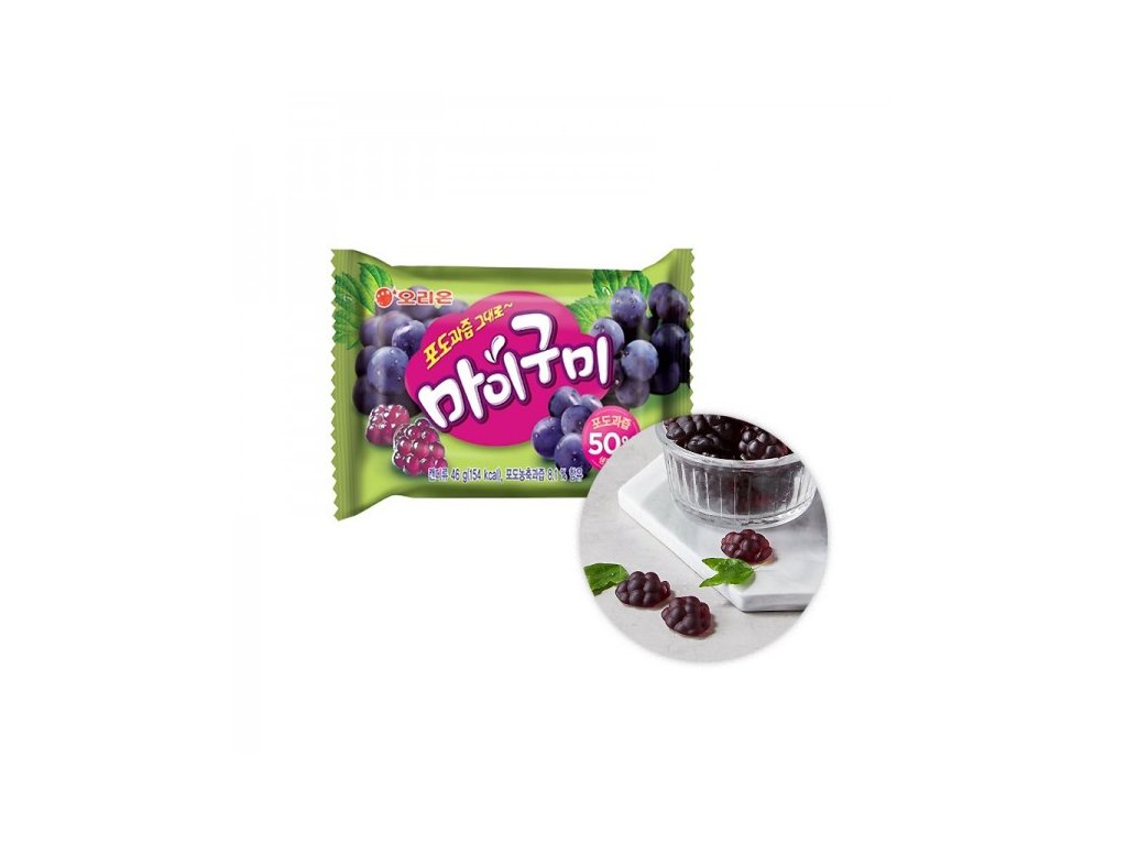 Složení: glukozový sirup, želatina, hroznový koncentrát, regulátor kyselosti E330, aroma, želírující látka E440, barvivo E163, olej olivový, kyselina E296.