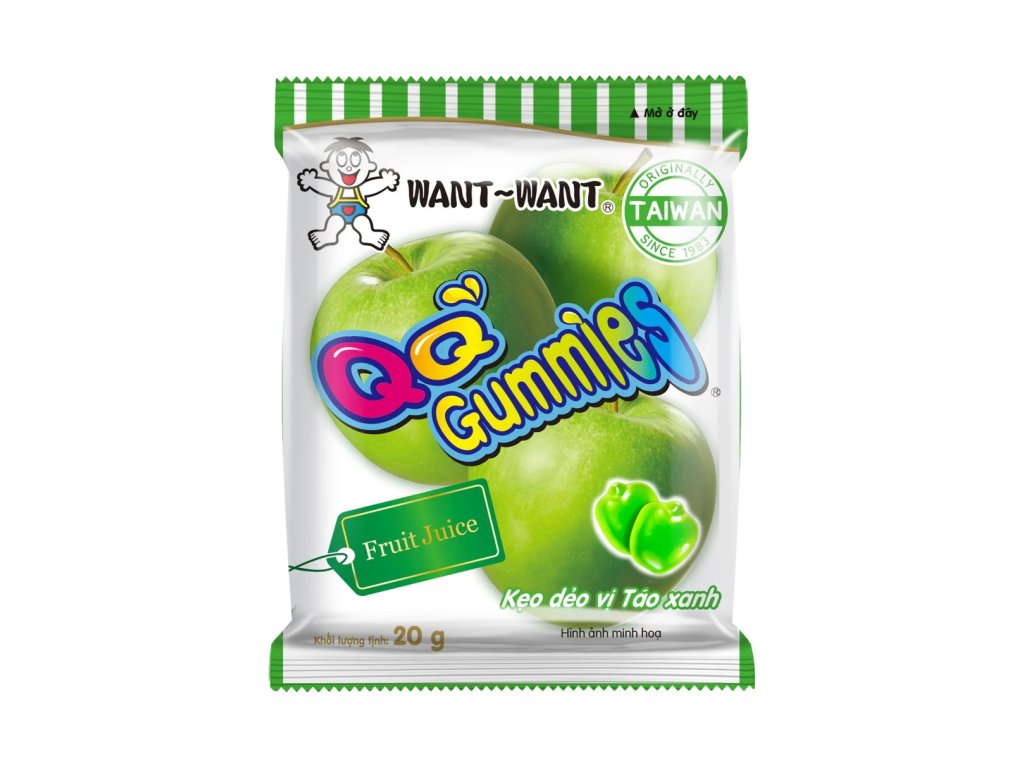 Složení: kukuřičný sirup, cukr, želatina, glukóza, regulátor kyselosti E330, E331, koncentrovaná jablečná šťáva 1 %, zvlhčující látka E420, aroma, zahušťovadlo E440, glazovací látka modifikovaný palmový olej, modifikovaný jádrový olej, E903, antioxidant E300, barviva E102, E133.
